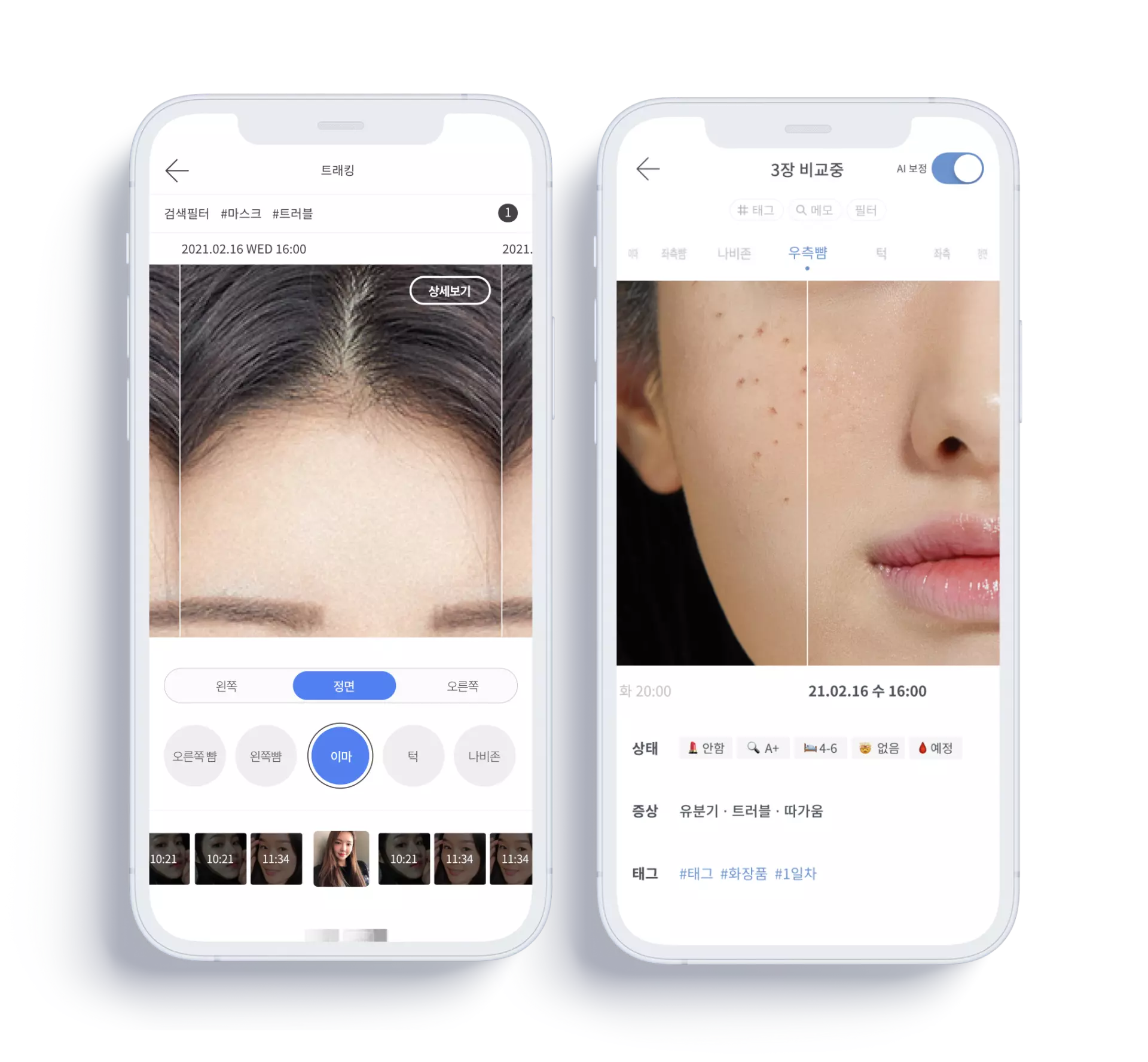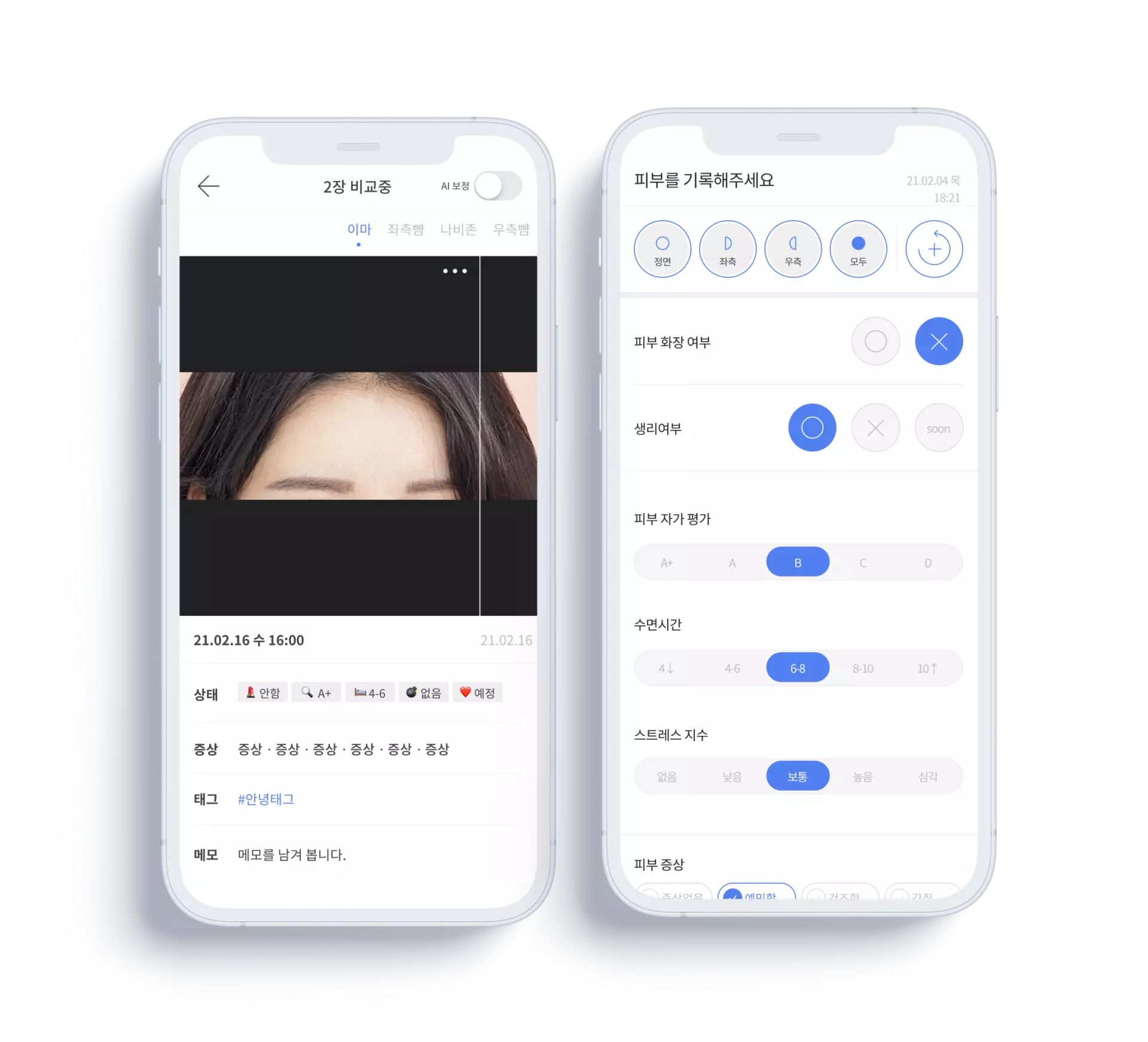 ‘똑똑한 피부 기록의 시작’ 스킨로그는 오직 나만을 위한 피부기록앱이에요.피부를 쉽게 기록하고, 작은 변화도 추적해보세요피부 기록하기내가 못 보던피부 변화를 나보다더 꼼꼼히 "피부가 왜 이렇게 안좋아졌지?"답은 그날의 피부기록에 있을 수도 있답니다.오늘은 어떤 화장품을 사용하셨나요?피부에 좋지 않은 음식을 드시지는 않으셨나요?오늘의 피부를 사진과 메모로 기록해보세요 피부 촬영하기3초 내로촬영을 빠르게 똑똑한 AI 카메라열심히 위치를 맞추고, 각도를 조정하지 않아도 돼요.정면, 좌측, 우측 3장의 사진만 찍으면알아서 위치를 맞추어 잘라드릴게요 AI 피부 보정작은 변화까지놓치지 않기 AI가 보정해주는 부위별 피부 사진내 피부 사진만 모아서 변화를 확인할 수 있어요.AI가 위치, 색감까지 자동으로 보정해준 부위별 피부 사진과 메모를함께 보며 한눈에 변화한 피부를 확인하세요.피부 비교에 최적화된 기능으로 미세한 변화도 절대 놓치지 않아요. DOWNLOAD on the PLAYSTOREDOWNLOAD on the APP STORE SkinLog